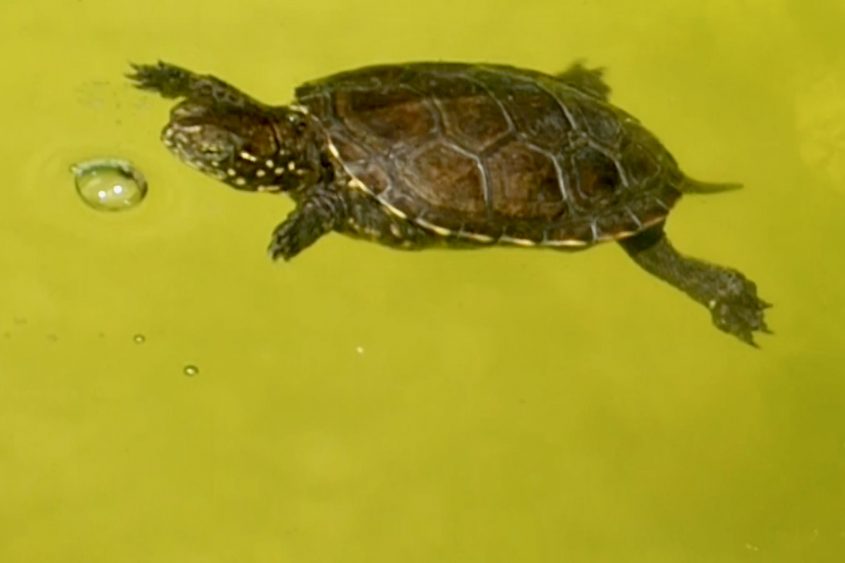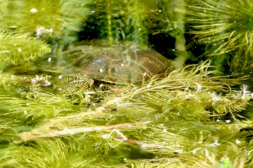Ihre Nahrung kann sie nur im Wasser verzehren, da die Sumpfschildkröte außerhalb des Wassers nicht schlucken kann.