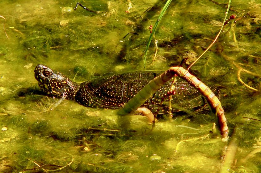 Die Europäische Sumpfschildkröte ernährt sich hauptsächlich vonWasserinsekten, Schnecken, Kaulquappen, toten Fischen und Aas, aber auch von Pflanzenkost .